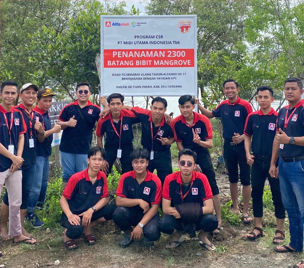 Alfamidi Cabang Medan melaksanakan kegiatan Corporate Social Responsibility (CSR) dengan menanam 1000 bibit pohon mangrove di Pantai Sei Tuan Indah, Kecamatan Pantai Labu, Kabupaten Deli Serdang, Sumatera Utara, Kamis (21/06/24). Kegiatan ini dilakukan dalam rangka memperingati 17 tahun Alfamidi melayani masyarakat Indonesia.